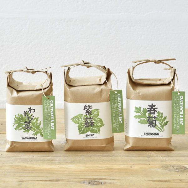 ¡Haga viajar a sus papilas gustativas y descubra los sabores y aromas del mundo! Estos kits de cultivo son un regalo único que viene en preciosas bolsas de papel como las tradicionales bolsas de arroz japonesas, y contienen plantas exóticas cultivar para el deleite de sus papilas. Cada kit incluye mezcla de cultivo, semillas e instrucciones. Una vez las plantas hayan crecido, podrá trasplantarlas fácilmente a un tiesto más grande o al jardín.